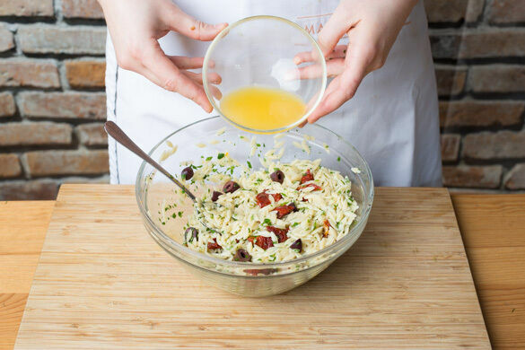 In der mediterranen Küche sind die kleinen Nudeln in Reisform sehr beliebt. Lerne sie kennen mit diesem aromatisch-fruchtigen Salat mit getrockneten Tomaten und Oliven, der mit frischem Orangensaft verfeinert wird. Eine perfekte Beilage zum saftig-würzigen Paprikahähnchen!