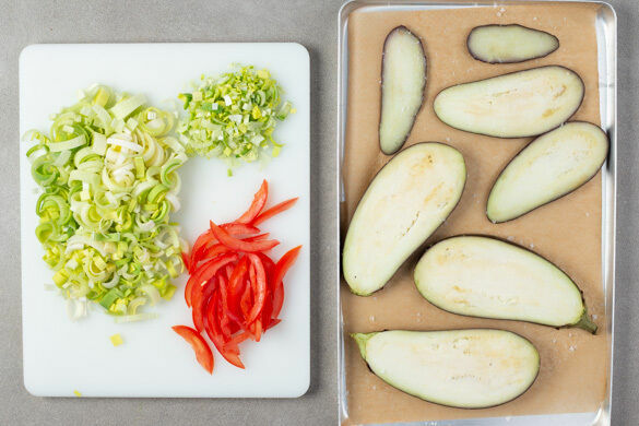 Den Backofen mit Grillfunktion oder Ober-/Unterhitze auf 250°C vorheizen. Den Lauch der Länge nach halbieren und quer in dünne Streifen schneiden, 2–3EL der Lauchstreifen grob hacken. Die Tomate in Spalten schneiden und entkernen. Die Aubergine in 0,5–1cm dünne Scheiben, von beiden Seiten mit 1 Prise Salz würzen und auf ein mit Backpapier ausgelegtes Backblech legen.