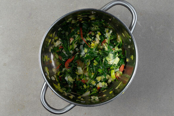 Den übrigen Lauch in einem großen Topf mit 1EL Olivenöl bei starker Hitze 1–2Min. anbraten. Die Tomaten, den Knoblauch, den Spinat und den Orangensaft unterrühren und das Gemüse noch ca. 1Min. abgedeckt garen, bis der Spinat zusammengefallen ist, mit Salz und Pfeffer abschmecken. Den Fisch mit den Auberginen und dem Spinatgemüse anrichten und servieren.