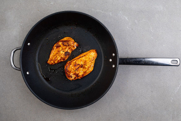 Das Fleisch von beiden Seiten mit Salz würzen und in einer großen Pfanne bei mittlerer Hitze auf jeder Seite ca. 2Min. anbraten. Vom Herd nehmen und in der Pfanne 2–3Min. ruhen lassen.