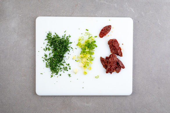 Inzwischen die Petersilienblätter von den Stängeln zupfen und fein hacken. Die Lauchzwiebeln in feine Ringe schneiden. Die getrockneten Tomaten abtropfen lassen.