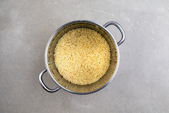 In einem mittelgroßen Topf 1L Wasser aufkochen und die Brühwürfel darin auflösen. Den Perlencouscous hinzugeben und 12–15Min. unter gelegentlichem Rühren kochen lassen, bis der Couscous bissfest ist. In ein Sieb abgießen und kalt abschrecken.