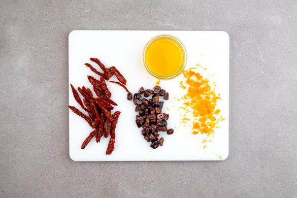Die getrockneten Tomaten in feine Streifen schneiden. Die Oliven halbieren. Die Orangenschale abreiben, dann die Orangen halbieren und auspressen.