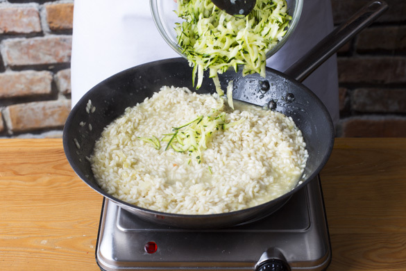 Zwischendurch die Zucchini mit einer Küchenreibe grob raspeln und 6–7Min. vor Ende der Kochzeit zum Risotto hinzugeben und mitgaren.