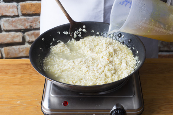 Die Zwiebeln in einer großen Pfanne mit 2EL Olivenöl bei mittlerer Hitze 1–2Min. farblos anschwitzen, dann den Reis hinzugeben und 1–2Min. mitbraten. Nach und nach mit der heißen Brühe ablöschen und rühren, bis der Reis sämig ist, aber noch etwas Biss hat – das dauert 18–20Min.