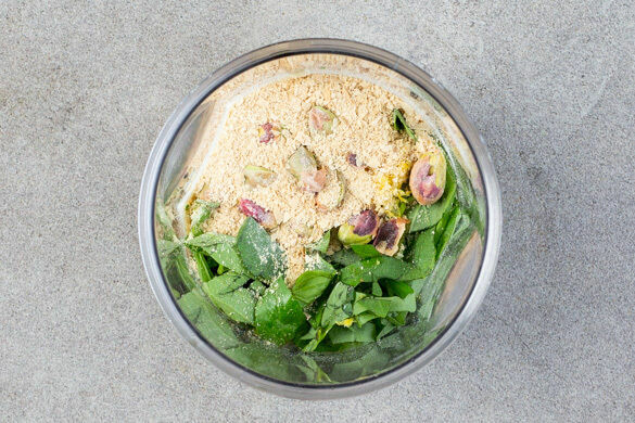 Das Basilikum samt Stängeln grob schneiden. Die Zitronenschale fein abreiben und die Zitrone halbieren, eine Hälfte auspressen, die andere Hälfte in Spalten schneiden. Das Basilikum, die Zitronenschale, die ½ der Pistazien und die Hefeflocken in ein hohes Gefäß geben.