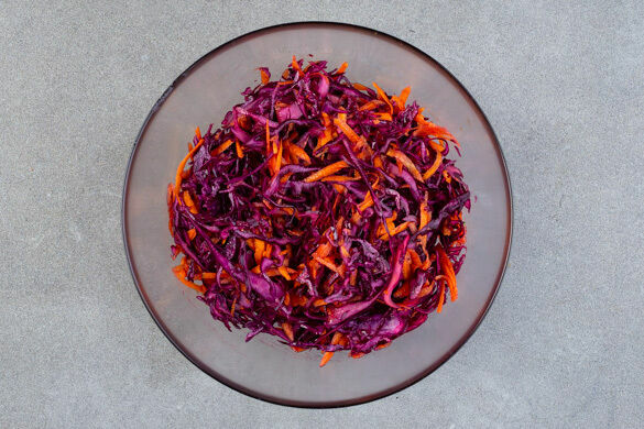 Die Karotten ggf. schälen und grob reiben. Den Rotkohl ebenfalls grob reiben und dann mit den Karotten, 1EL Pflanzenöl, 1½EL Essig und ½TL Salz vermengen. Gut durchkneten und beiseitestellen.