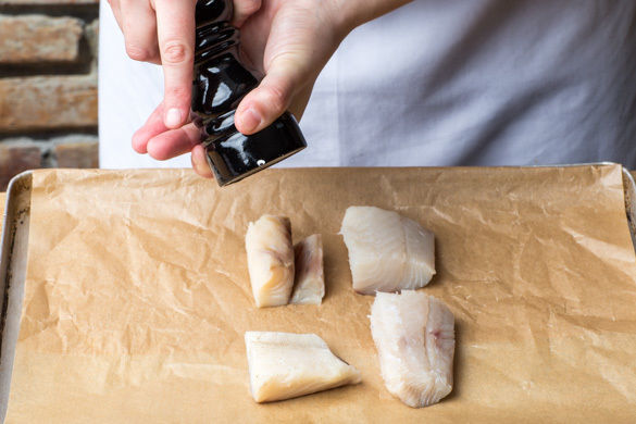 Den Fisch in 4–5 gleich große Stücke schneiden, dabei Gräten ggf. mit einer Pinzette entfernen. Mittig auf ein mit Backpapier ausgelegtes Backblech legen, sodass auf beiden Seiten noch Platz für den Brokkoli bleibt. Den Fisch mit Salz und Pfeffer würzen.