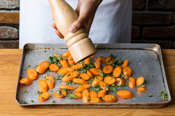 Die Karotten mit 2EL Olivenöl und der gehackten Petersilie mischen und mit Salz und Pfeffer würzen. Auf einem Backblech verteilen und 10–15Min. im Ofen rösten, bis die Karotten leicht gebräunt sind.