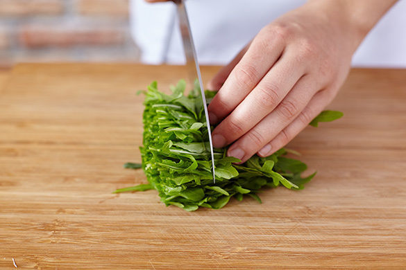 Inzwischen die harten Rucolastiele entfernen und den Rucola halbieren.