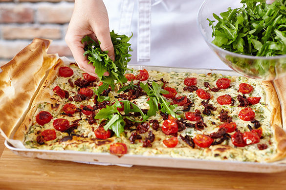 Ob zu Hause am gedeckten Tisch oder ganz gemütlich auf der Picknickdecke im Park: Diese Tarte kann prima vorbereitet werden und ist überall der perfekte Begleiter. Die Zubereitung ist kinderleicht, und mit saftigen Kirschtomaten, getrockneten Tomaten, Crème fraîche, Rucola und Provence-Kräutern ist die Tarte üppig belegt und richtig lecker!