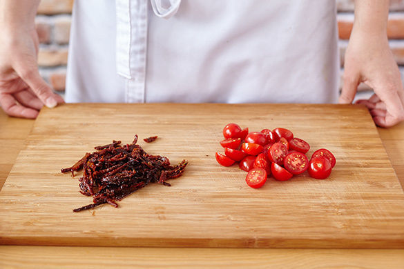 Die Kirschtomaten halbieren. Die getrockneten Tomaten abgießen und in dünne Streifen schneiden. Beides in einer Schüssel mit 1EL Olivenöl vermengen.