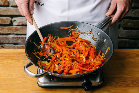 Die Paprika und die Zwiebeln in einer großen Pfanne mit 1EL Olivenöl bei mittlerer Hitze 5–6Min. unter Rühren anbraten, bis das Gemüse weich ist. Ggf. etwas Wasser zugeben. Das Gemüse mit dem Gulaschgewürz sowie Salz und Pfeffer würzen.