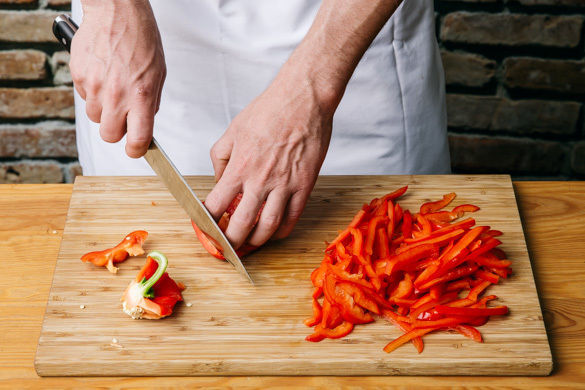 Die Paprika halbieren, entkernen und in dünne Streifen schneiden.