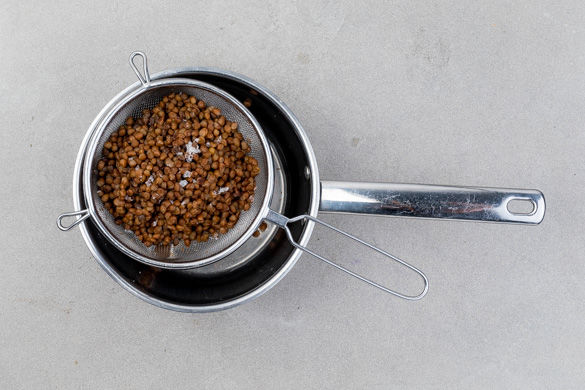 Die Linsen in einem Sieb unter fließendem Wasser abspülen. Mit 1L Wasser in einen mittelgroßen Topf geben, einmal aufkochen und anschließend 3–5Min. im heißen Wasser ziehen lassen. Die Linsen in ein Sieb abgießen und abtropfen lassen, mit Salz und Pfeffer würzen und warm halten.