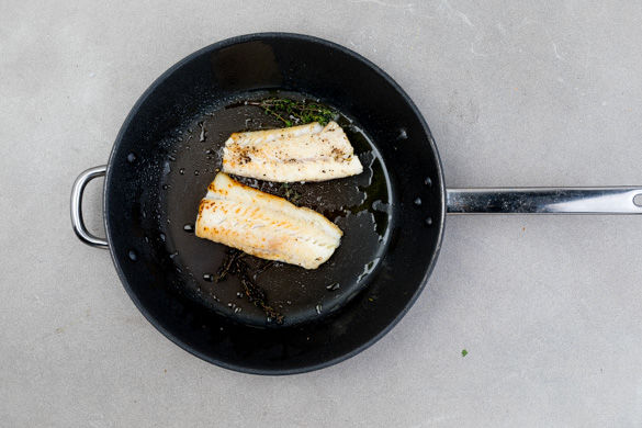 Den Fisch in 3–4EL Mehl wenden und mit 1–2EL Olivenöl und dem Zitronenthymian in einer mittelgroßen Pfanne bei mittlerer Hitze von jeder Seite ca. 2–3Min. anbraten. Den Linsensalat nach Wunsch erneut mit Salz und Pfeffer abschmecken und mit dem Fisch und dem Feldsalat garniert servieren.