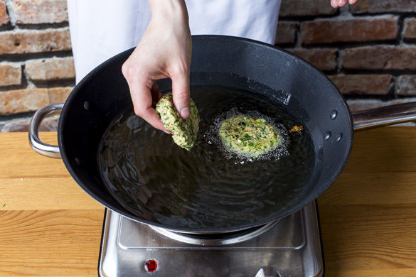 In einer großen Pfanne 2–3EL Olivenöl hoch erhitzen. Für jeden Bratling 1–2EL Teig in die Pfanne geben und bei mittlerer bis starker Hitze 2–3Min. auf jeder Seite braten. Die Bratlinge auf Küchenkrepp abtropfen lassen. Den Vorgang wiederholen, bis der gesamte Teig aufgebraucht ist.