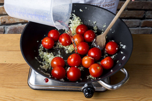Die Zwiebeln in einer mittelgroßen Pfanne mit 1EL Olivenöl und 1 Prise Salz bei mittlerer Hitze ca. 2Min. anbraten. Inzwischen die Kirschtomaten halbieren. Die Tomaten mit 100ml Wasser, 1–2TL Essig und 1EL Zucker in die Pfanne geben und alles 10–15Min. sanft köcheln lassen. Mit Salz und Pfeffer abschmecken und die Tomaten mit einer Gabel leicht zerdrücken.
