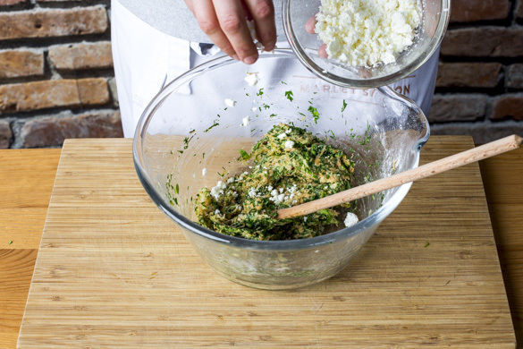 Die Chili entkernen und fein hacken. 1TL Dill und 1TL Chili beiseitelegen. Den restlichen Dill mit den Karotten, der Zucchini, 50g Weizenmehl, 1 Ei, dem gehackten Koriander und Chili nach Geschmack verkneten. Mit Salz und Pfeffer würzen. Ggf. mehr Mehl hinzufügen, sodass eine feste Masse entsteht. Den Feta zerbröseln und die 1/2 des Fetas unterrühren.