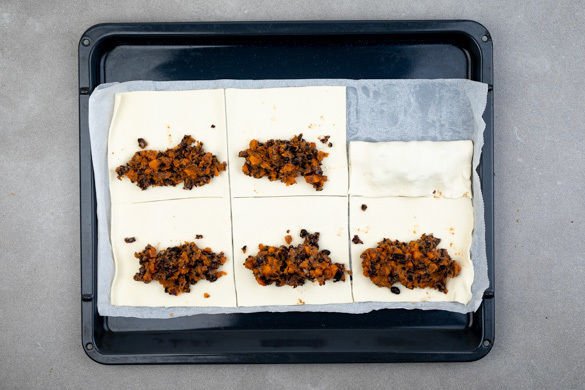 Den Blätterteig mit dem Papier nach unten auf einem Backblech ausrollen und in 6 gleich große Quadrate schneiden. Die Süßkartoffel-Bohnen-Masse auf den unteren Hälften der Teigstücke verteilen, die leere Hälfte darüberklappen und die Ränder mit einer Gabel oder den Fingern gut verschließen. Die Empanadas im Ofen 15–20Min. backen, bis sie goldbraun und gar sind.