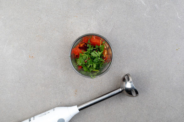 Das Grillgemüse leicht abkühlen lassen, dann die Zwiebel, die Tomaten und den Knoblauch schälen. Den Koriander samt Stängeln grob hacken. Die Limette halbieren und auspressen. Die Zwiebel, die Tomaten, die Chili, den Knoblauch, den Koriander und 3/4 des Limettensafts zu einer groben Salsa pürieren und mit Salz und 1 Prise Zucker abschmecken.