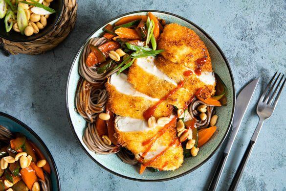 Mmh, es gibt knusprig paniertes Hühnchen auf einer würzig-pikanten Nudelpfanne aus leckeren Sobanudeln und viel frischem Gemüse. Geröstete Erdnüsse sind das knackige Schmankerl on top. Schnelle Feierabendküche mit Suchtpotenzial!