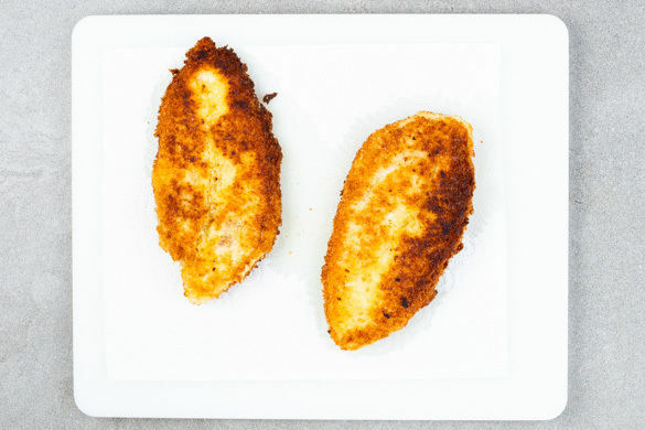 Das Fleisch trocken tupfen, jeweils horizontal halbieren und von beiden Seiten mit je 1 Prise Salz und Pfeffer würzen. 1 Ei mit 2EL Wasser verquirlen. Das Fleisch der Reihe nach in 6EL Mehl wenden, durch das Ei ziehen und abschließend im Panko-Paniermehl wenden. Die Panade leicht andrücken.