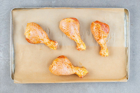 Den Backofen auf 240°C (220°C Umluft) vorheizen. Die Drumsticks trocken tupfen. 2EL Olivenöl mit dem Paprikapulver, 1TL Salz und etwas Pfeffer verrühren und das Gewürzöl kräftig mit den Händen in die Drumsticks einmassieren. Die Drumsticks etwas abtropfen lassen und auf einem mit Backpapier ausgelegten Blech 35–40Min. im Ofen garen. Das restliche Gewürzöl aufbewahren.