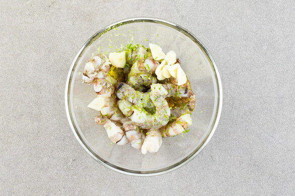 Die Garnelen in einem Sieb kalt abspülen, abtropfen lassen und mit etwas Küchenkrepp trocken tupfen. Mit dem Knoblauch, der Limettenschale und 1EL Olivenöl vermengen.