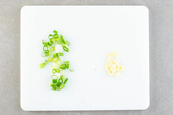 In einem mittelgroßen Topf ausreichend gesalzenes Wasser für die Pasta zum Kochen bringen. Die Lauchzwiebel schräg in feine Ringe schneiden. Den Knoblauch schälen und in hauchfeine Scheibchen schneiden.