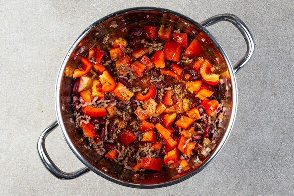 Die Tomaten und die Paprika in den Topf geben und ca. 1Min. mitbraten, dann mit je 1 Prise Salz und Pfeffer würzen. Die Bohnen, das Brühgewürz und 100ml Wasser hinzufügen, aufkochen und dann bei mittlerer Hitze 10–12Min. köcheln lassen, bis das Gemüse weich ist. Ggf. mehr Wasser zugeben, falls die Sauce zu dickflüssig ist. Mit 1EL Essig sowie Salz und Pfeffer abschmecken.