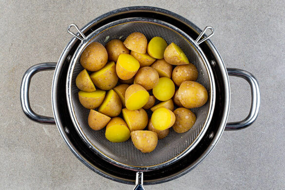 Die Kartoffeln samt Schale halbieren, in einen mittelgroßen Topf geben und mit kaltem Wasser bedecken. Das Wasser bei starker Hitze zum Kochen bringen, dann 1EL Salz hinzufügen und die Kartoffeln bei mittlerer Hitze 7–10Min. kochen, bis sie gar sind. In ein Sieb abgießen und etwas abkühlen lassen.