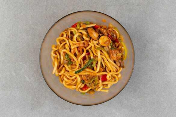 Wer kennt und vergöttert sie nicht, die cremige Carbonara-Sauce aus Eigelb, würzigem Käse und einem Schuss Kochwasser? Auch in diesem fix zubereiteten Rezept macht sie sich als seidige Komponente mit zart gebratenem Hähnchenschenkelfilet und vorgeschnittenem Gemüse sehr gut auf deinem Teller. Der Clou: Heute verwenden wir dicke Udon-Nudeln, pikante Gochujang-Paste und Sojasauce für den koreanischen Kick. Unbedingt probieren!