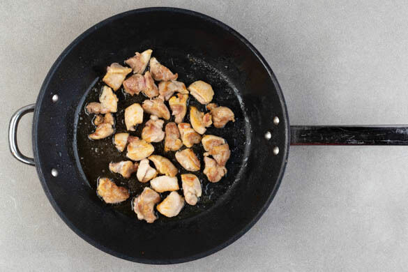 Das Fleisch trocken tupfen, in 2–3cm große Stücke schneiden und in einer großen Pfanne mit 1EL Pflanzenöl bei mittlerer bis starker Hitze auf jeder Seite ca. 2Min. anbraten. Mit 1 kräftigen Prise Salz würzen.