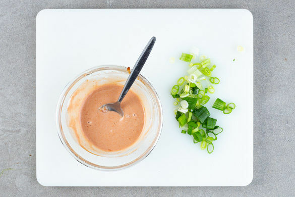 Die Lauchzwiebel in feine Ringe schneiden. 2EL Mayonnaise und 1EL Ketchup verrühren und den Dip mit Salz und Pfeffer abschmecken.