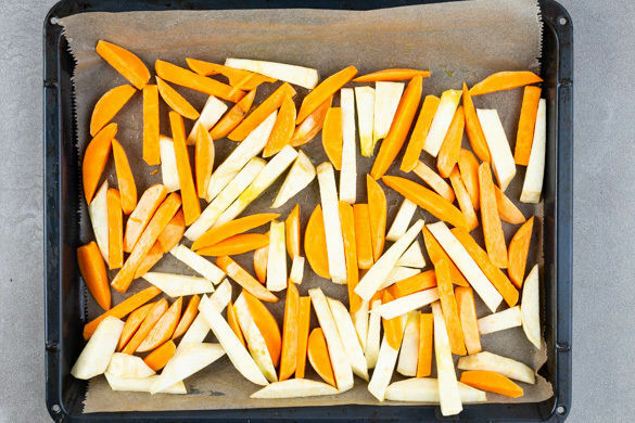 Die Gemüsepommes auf einem zweiten mit Backpapier ausgelegten Backblech verteilen, mit 2EL Olivenöl vermengen und 20–25Min. im Ofen backen.