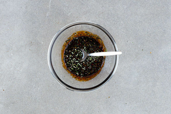 Die ½ des Ketjap Manis mit dem restlichen Gewürzöl und dem Rosmarin verrühren.
