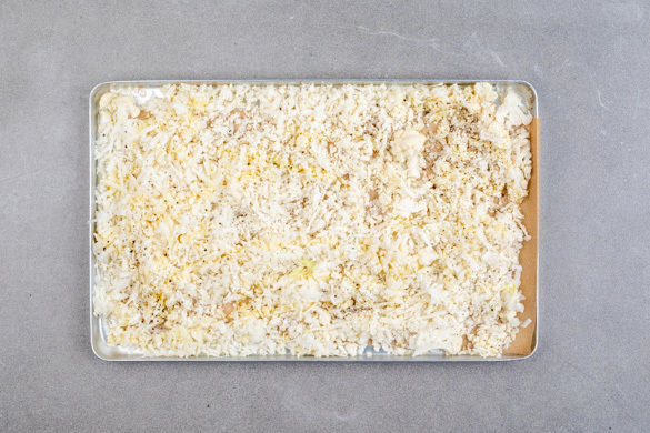 Den Blumenkohl mit einer Küchenreibe grob raspeln und auf einem mit Backpapier ausgelegten Backblech ausbreiten. Mit ca. 1EL Olivenöl beträufeln und mit 1 Prise Salz und Pfeffer würzen. Für 6–8Min. im Ofen backen.