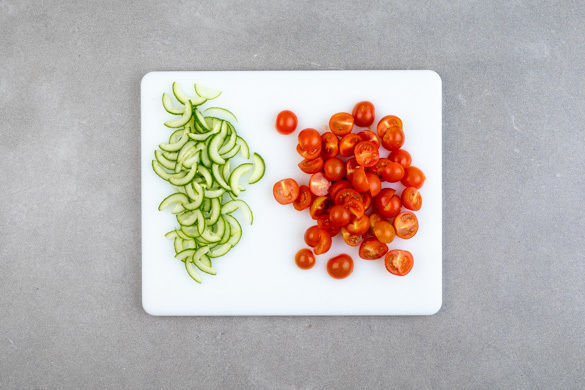 Die Gurke längs halbieren und die Kerne mit einem Teelöffel auskratzen, dann die Gurke in sehr dünne Scheibchen schneiden. Die Kirschtomaten halbieren.