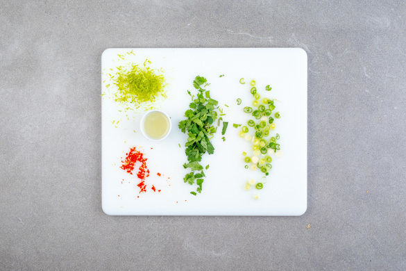 Die Lauchzwiebel in sehr feine Ringe schneiden. Den Koriander samt Stängeln grob hacken. Die Chilischote halbieren, entkernen und fein hacken. Die Limettenschale abreiben, dann die Limette halbieren und auspressen. Die Sataysauce mit der Limettenschale und dem Limettensaft nach Geschmack verfeinern.