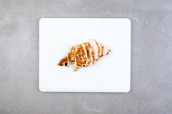 Den Blumenkohlreis auf Teller verteilen und mit den Gurken und den Kirschtomaten belegen. Das Fleisch in Scheiben schneiden und mit der Sataysauce, den restlichen Erdnüssen, den Lauchzwiebeln und dem Koriander auf dem Gemüse anrichten. Nach Belieben mit der Chili garnieren und servieren.