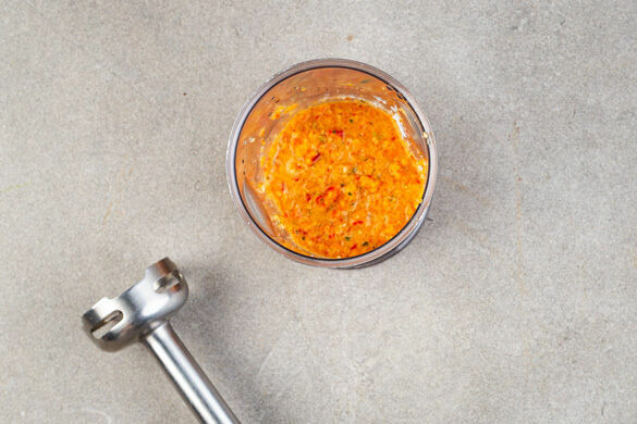 Die Paprika vierteln, entkernen und in 1–2cm große Stücke schneiden, dann in einer mittelgroßen Pfanne mit 1EL Olivenöl und 1/2TL Salz bei mittlerer bis starker Hitze in 5–7Min. weich braten.