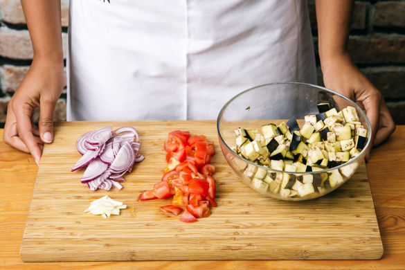 Inzwischen die Aubergine in ca. 1cm große Würfel schneiden und diese mit 1–2TL Salz einreiben. Die Tomaten in 1–2cm große Würfel schneiden, dabei den Strunk entfernen. Die Zwiebel schälen, halbieren und in feine Streifen schneiden. Den Knoblauch schälen und in feine, längliche Scheibchen schneiden.
