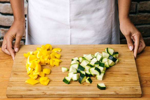 Die Paprika vierteln, entkernen und in 1–2cm große Stücke schneiden. Die Zucchini längs vierteln und ebenfalls in 1–2cm große Würfel schneiden.