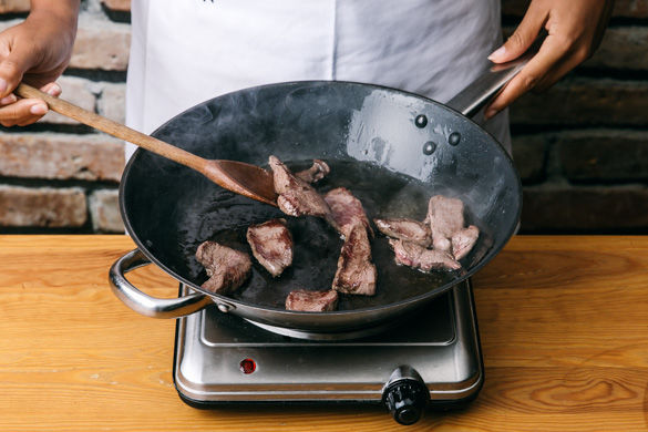 Das Fleisch in einer großen Pfanne mit 1–2EL Olivenöl bei starker Hitze 2–3Min. scharf anbraten. Mit Salz und Pfeffer würzen und auf einem Teller beiseitestellen.