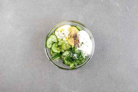Die Gurke längs halbieren und in möglichst dünne Scheibchen schneiden. Die Gurkenscheiben mit dem Zitronensaft, der 1/2 des Dills, dem Joghurt, der 1/2 des Senfs und 1EL Olivenöl vermengen und den Salat mit Salz, Pfeffer und Zucker nach Geschmack würzen. Ggf. mehr Senf nach Geschmack hinzugeben.