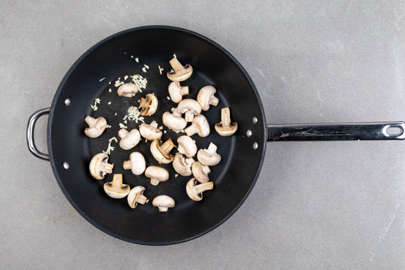 Die Pilze in einer großen Pfanne ohne Zugabe von Fett bei mittlerer Hitze 4–5Min. braten, bis sie schrumpfen und Flüssigkeit abgeben. Den Knoblauch hinzugeben und 2–3Min. mitbraten.