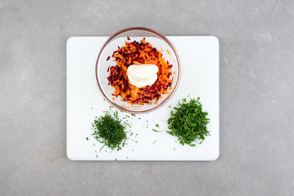 Währenddessen die Petersilienblätter von den Stängeln zupfen und fein hacken. Den Schnittlauch in feine Röllchen schneiden. Die Karotten mit der 1/2 der Mayonnaise mischen und den Salat mit dem Zitronenabrieb sowie Salz und Pfeffer abschmecken. Beiseitestellen. Tipp: Wer mag, kann auch die ganze Mayonnaise verwenden. Beiseitestellen.