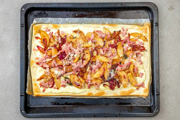 Die Teige mit dem Papier nach unten auf zwei Backbleche ausrollen und gleichmäßig mit der Crème fraîche bestreichen, dabei einen Rand von ca. 1cm freilassen. Mit je 1 kräftigen Prise Salz und Pfeffer würzen, dann die Apfel-Zwiebel-Mischung darauf verteilen und mit dem Speck bestreuen.