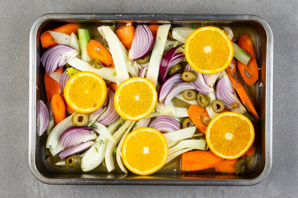 Die Zitrone halbieren, eine Hälfte auspressen. Die Orange halbieren, eine Hälfte auspressen, die andere Hälfte in Scheiben schneiden. Das Brühgewürz in 150ml warmem Wasser auflösen. Das Gemüse, die Zwiebeln, den Knobi, die Oliven, den Rosmarin, den Zitronen- und Orangensaft, die Orangenscheiben und die Brühe in eine große Auflaufform geben.